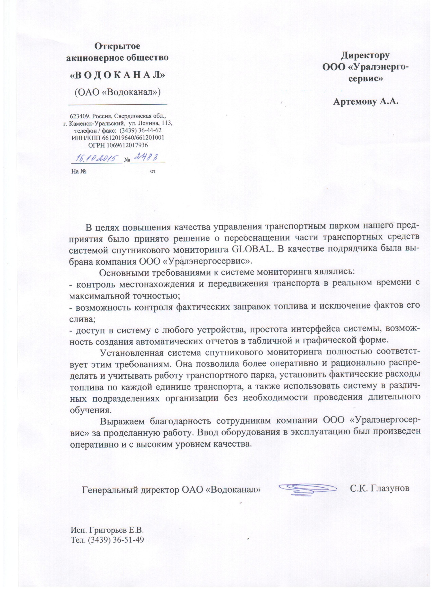 В целях повышения качества управления транспортным парком нашего предприятия было принято решение о переоснащении части транспортных средств системой спутникового мониторинга GLOBAL. В качестве подрядчика была выбрана компания ООО «Уралэнергосервис».